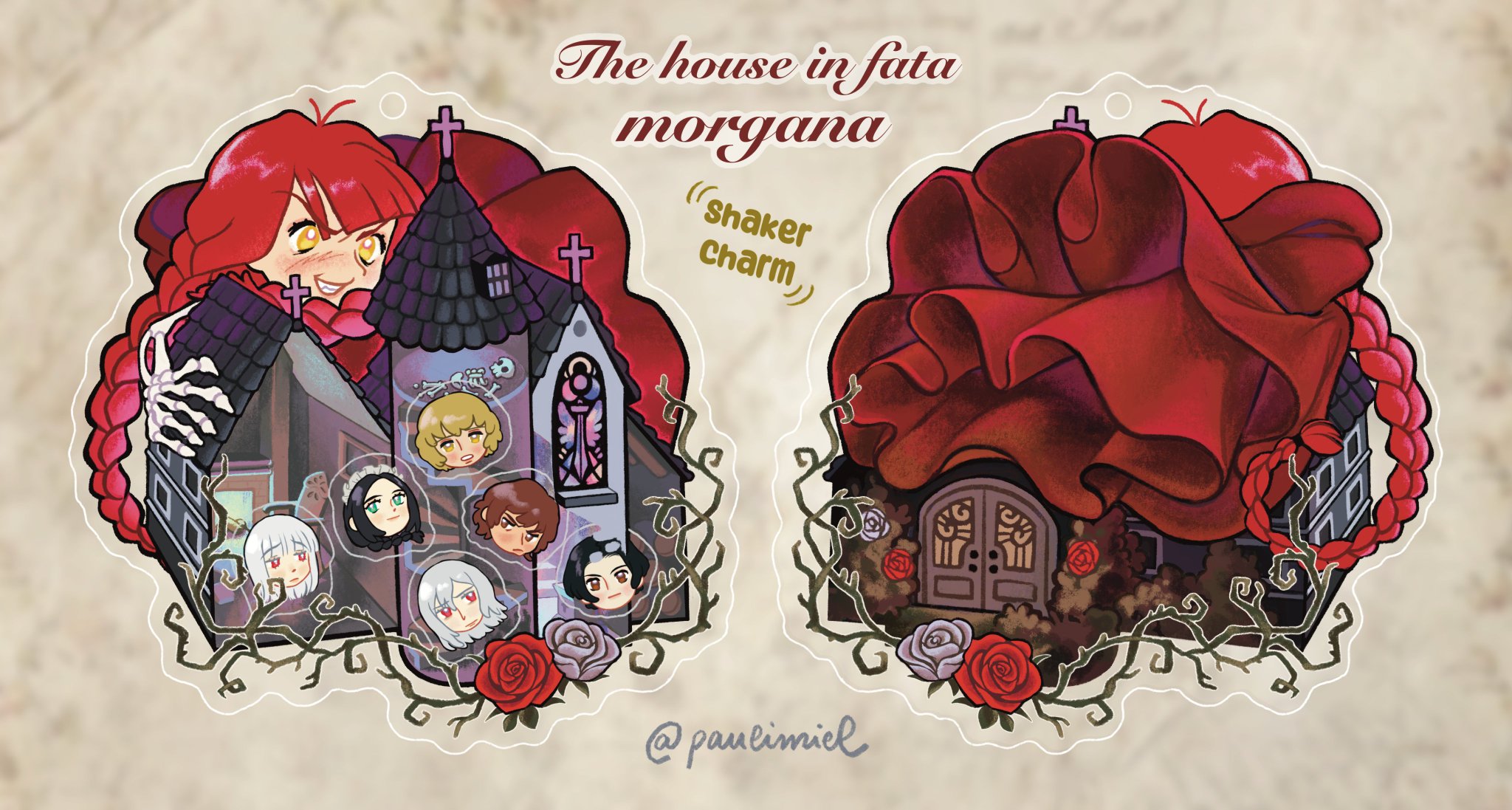 3x3 inch acrylic charm shaped like the House in Fata Morgana, haunted by Morgana. Inside, there are six characters including Michel, the Maid, the White-Haired Girl, Mell, Yukimasa, and Jacopo. Each are 0.47in in diameter (1.2cm).