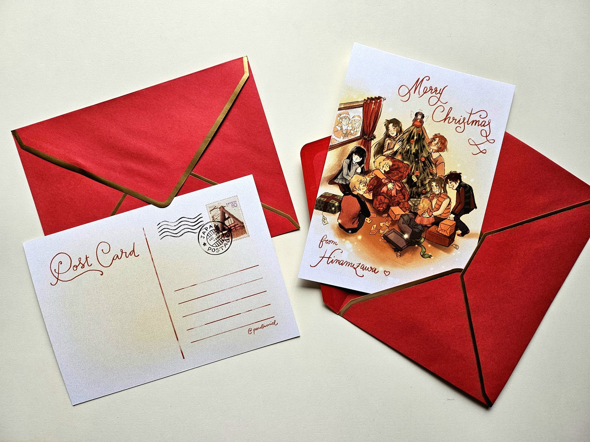 5x7inch shimmering postcard featuring the characters from Higurashi: When They Cry. The characters featured include Maebara Keiichi, Sonozaki Mion, Sonozaki Shion, Ryugu Rena, Furude Rika, Hojo Satoko, Hojo Satoshi, Takano Miyo, and Tomitake Jiro. It also features a little Hanyuu as the angel on top of the Christmas tree!