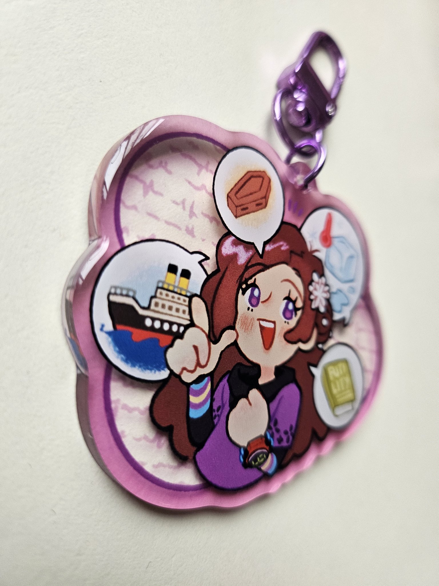 2.5 inch acrylic charm keychain featuring the character Akane Kurashiki from the game 9 Hours 9 Persons 9 Doors! She would love nothing more than to tell you about this one weird thing where...
