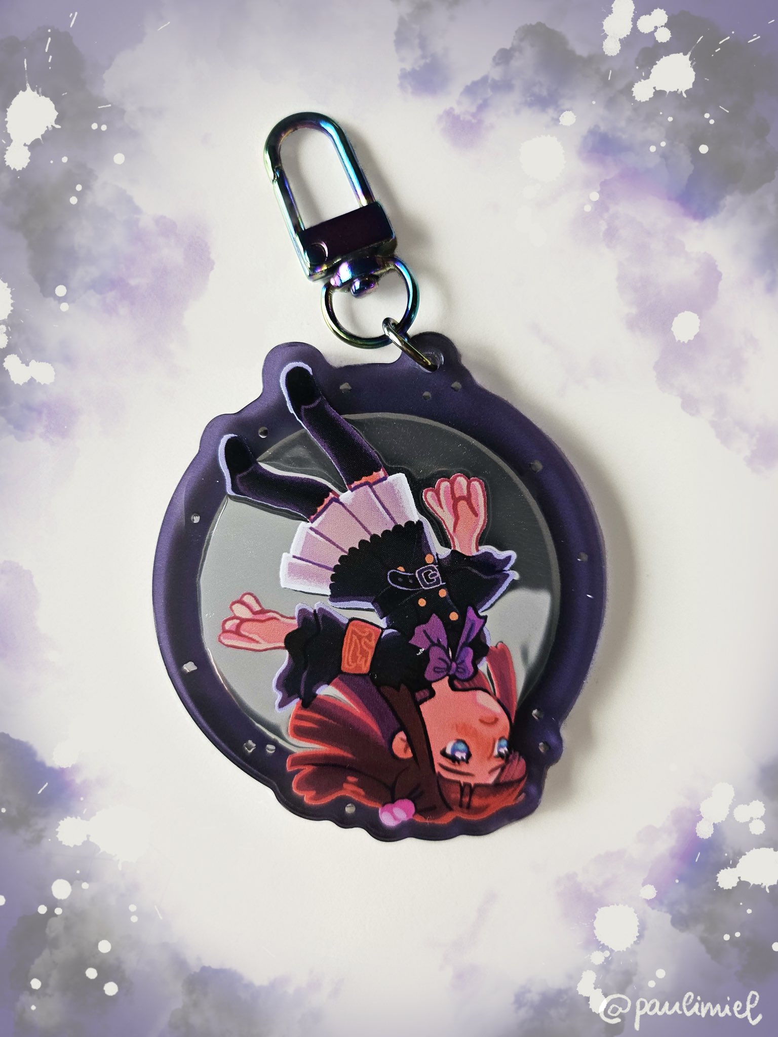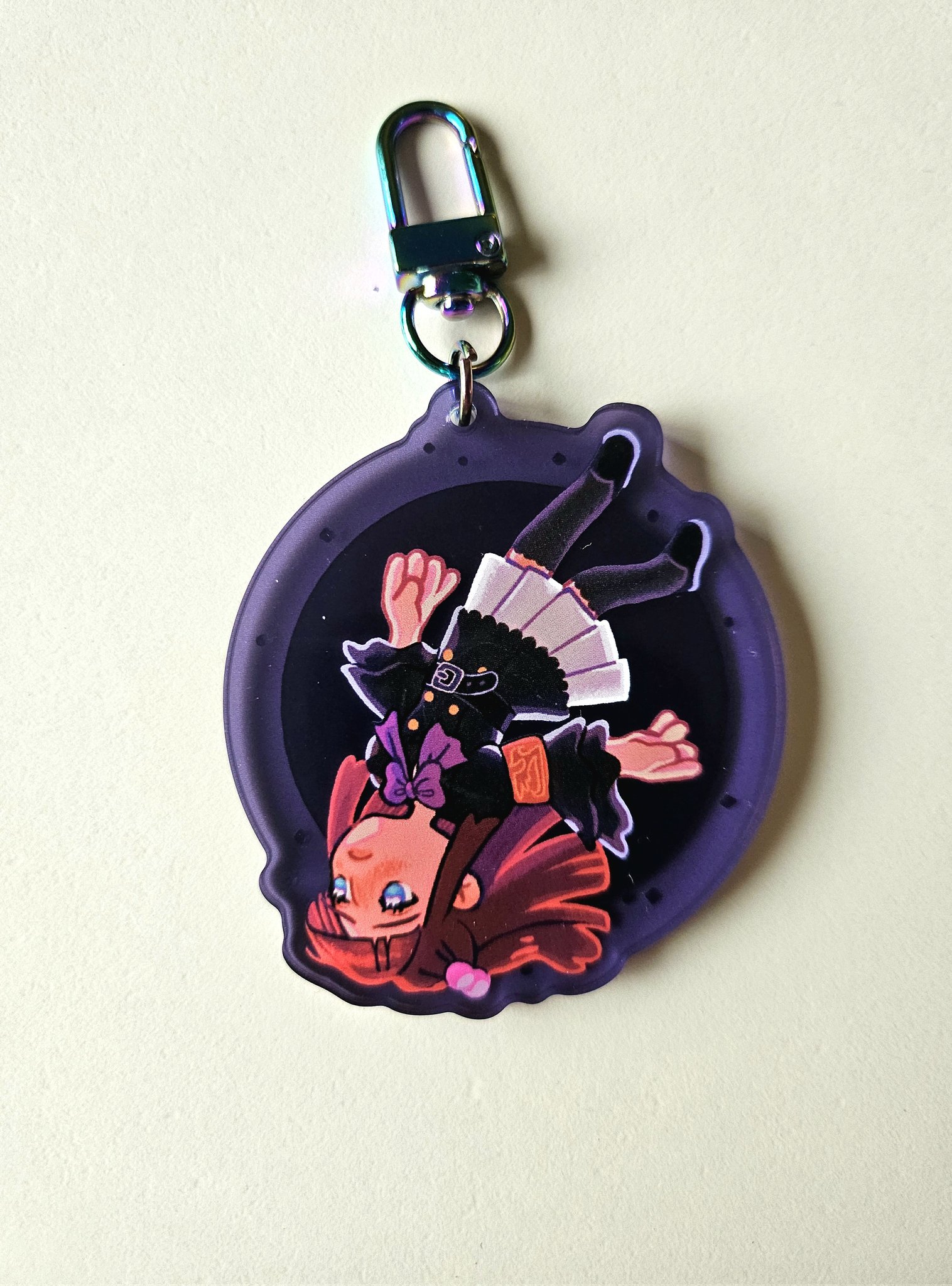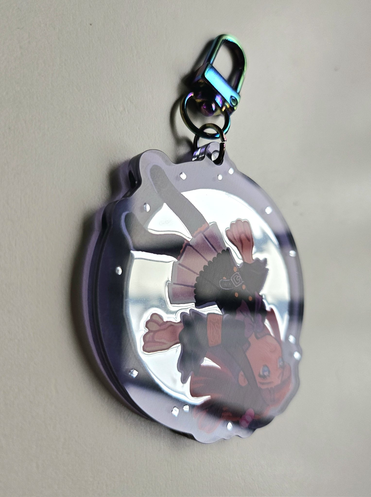 2.5 inch acrylic charm keychain featuring the character Ange Ushiromiya from Umineko No Naku Koro Ni. The charm has a layer of raised silver foil for the star on the top, and has a layer of silver foil behind the design for the moon. The foil is only visible on the front of the design.