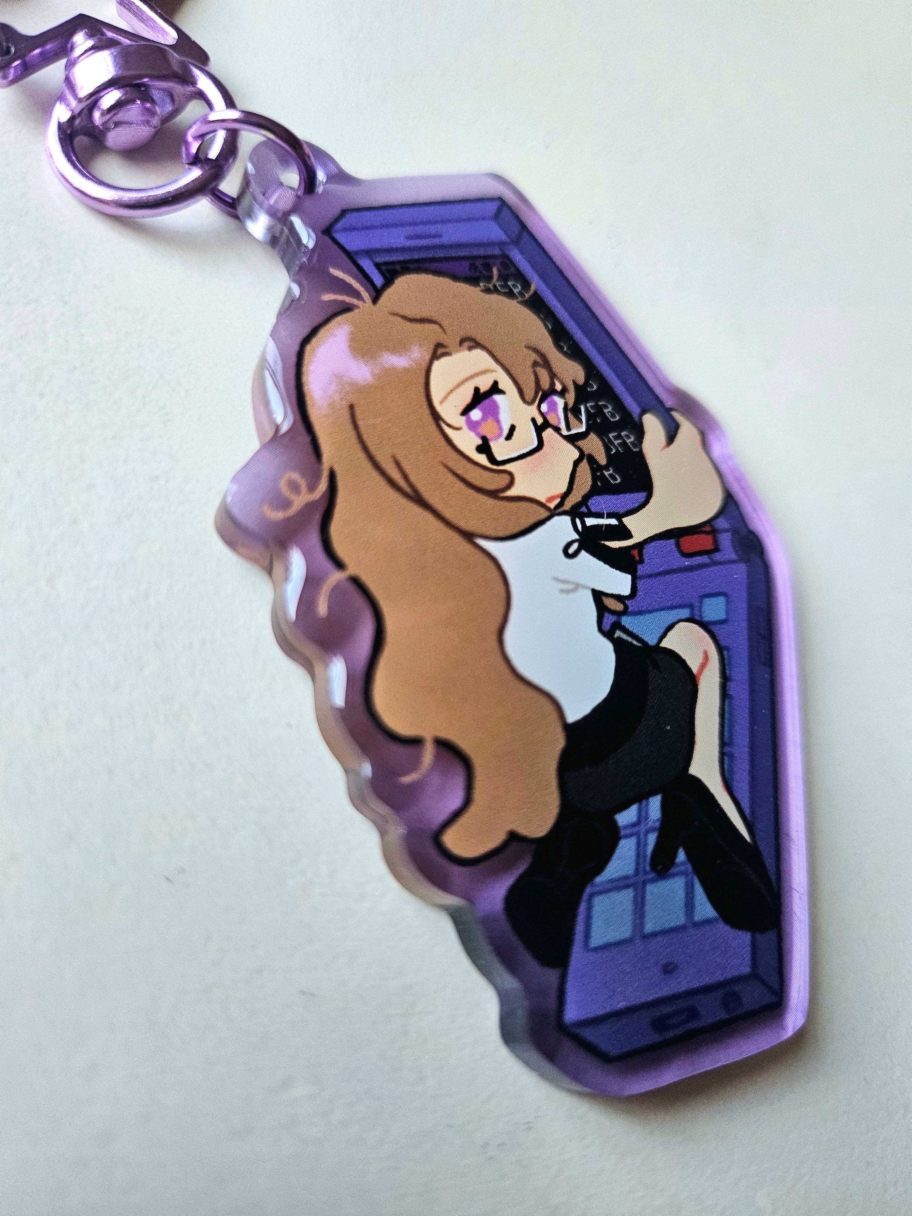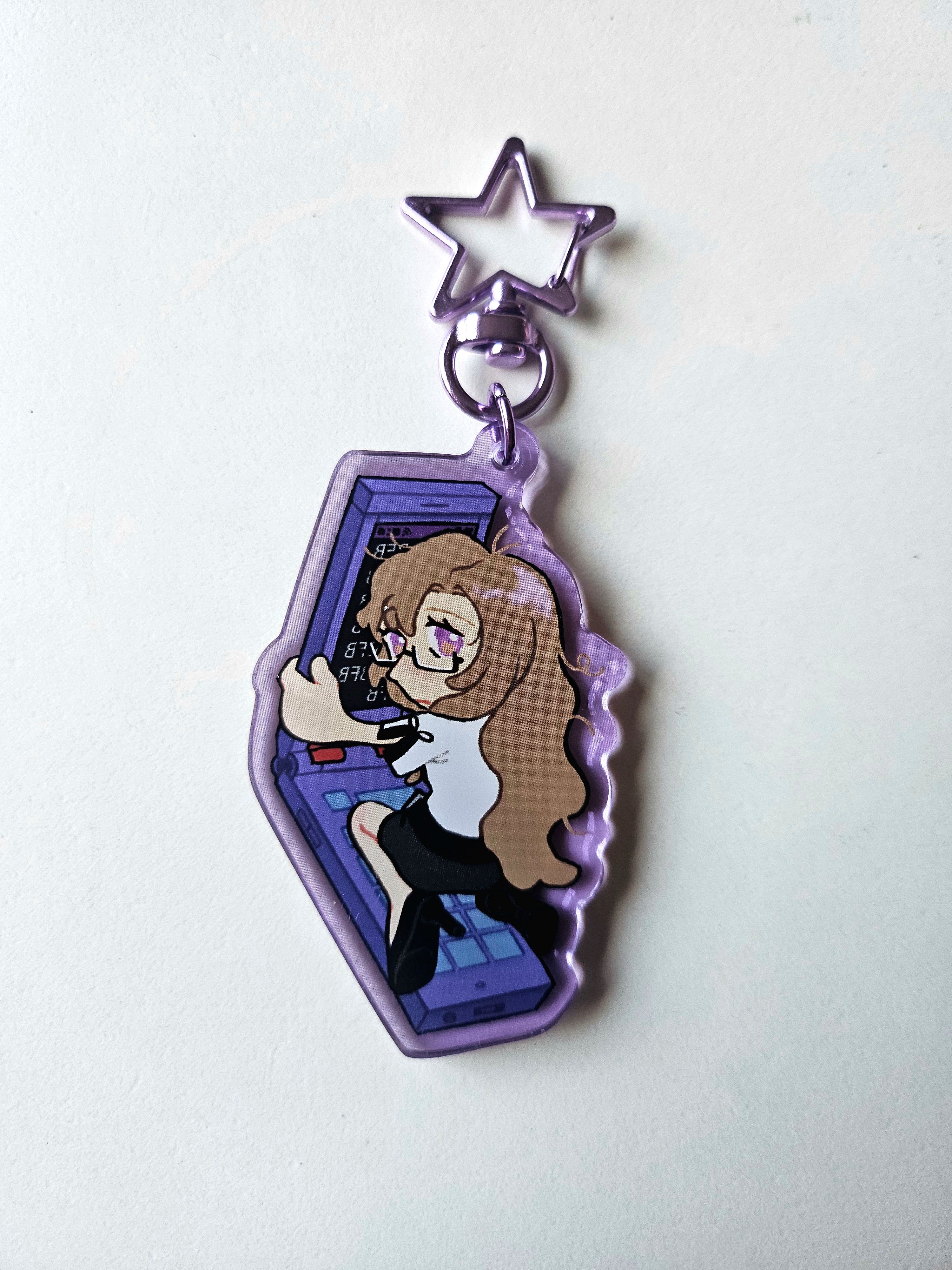 2.5 inch acrylic charm keychain featuring the character Kiryu Moeka from Steins;Gate. Despite her size, Shining Finger still texts at the speed of light!